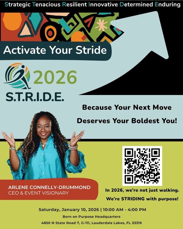 Join us on Saturday, January 10th, 2026, for an immersive, hands-on event that will ignite your purpose and set the pace for a transformative year. STRIDE 2026 is more than an event—it’s your launchpad to align your goals, refine your strategies, and move with intention toward the life you envision.
